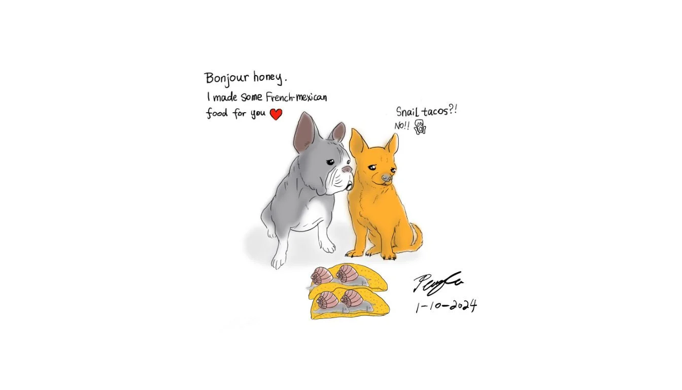 Pierre, the French Bulldog, stood proudly in the kitchen, his tail wagging with excitement. Tonight was special—he had spent hours crafting the perfect meal for Coco, his beloved Chihuahua. He wanted to surprise her with a fusion of their cultures: French escargots inside crispy Mexican tacos.